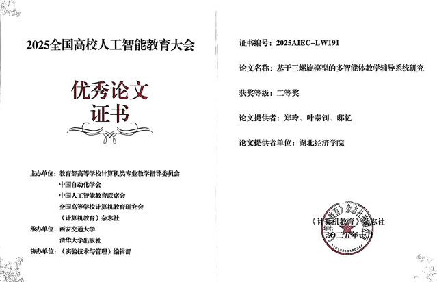 近日,我院人工智能系鄭玲和邸憶老師合作的教研論文《基于三螺旋模型的多智能體智能輔導系統研究》被2025年全國高校人工智能教育大會(AIEC2025)收錄并獲評優秀論文二等獎。本次全國高校人工智能教育大會主要圍繞人工智能學科教育和人才培養相關主題進行分享和交流,研讨人工智能課程體系改革,推進教育、科技、人才“三位一體”協同融合發展。